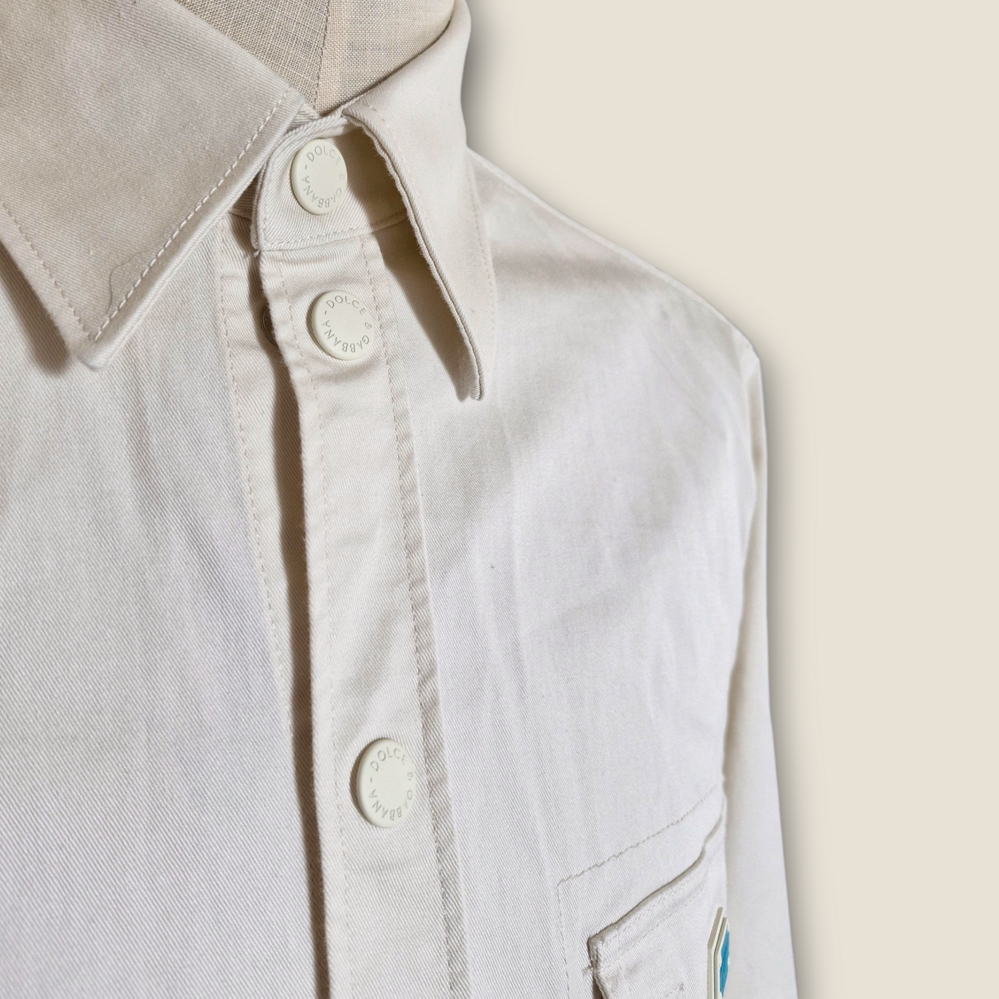 This Dolce and Gabbana overshirt, crafted in Italy from premium cotton, offers a sophisticated blend of style and comfort. In a versatile cream shade and sized at 41 (equivalent to UK large), it delivers a refined fit while maintaining breathability and softness. Ideal for layering or as a standout piece, this overshirt exemplifies Italian craftsmanship and timeless elegance. New WITHOUT tags protective blue film over the breast badge. RRP £950.